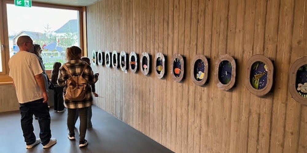 Zur Vernissage am 4. April waren nicht nur Eltern, Großeltern und Verwandte eingeladen, sondern alle, die Interesse an Kunst und kreativer Bildung haben. Die Aula des Schulhauses platzte aus allen Nähten, so gross war das Interesse der Gemeinde und der Familien. Die Besucherinnen und Besucher hatten die Möglichkeit, sich frei zwischen den Kunstwerken zu bewegen, sie zu bewundern und mit den jungen Künstlerinnen und Künstlern ins Gespräch zu kommen.