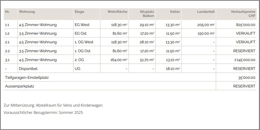 Unabhängig davon, ob eine kleine oder grosse Familie, ein Singlehaushalt oder ein Paar; die geplanten Grundrisse werden Ihre Ansprüche erfüllen. Der Innenausbau kann individuell durch Sie als Käufer bestimmt werden. Gerne stellen wir Ihnen dieses schöne Projekt in einem persönlichen Gespräch vor.