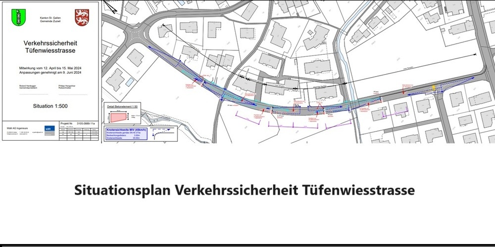 Das Ingenieurbüro schlug in Absprache mit der Kantonspolizei dem Gemeinderat zwei Varianten vor, wie der Verkehr auf der Tüfenwiesstrasse beruhigt werden könnte. Der Gemeinderat sprach sich für diejenige Variante aus, gemäss derer die bestehenden fünf Parkfelder neu angeordnet und Betonelemente mit Abweispfeilen auf die Strasse gestellt werden. Ergänzend werden zwischen Strasse und Trottoir, wo der Randstein abgesenkt ist, weitere Poller gesetzt, damit das Trottoir beim Ausweichen vor verkehrsberuhigenden Elementen nicht befahren werden kann. Der Gemeinderat lud die Bevölkerung vom 12. April bis 12. Mai 2024 ein, im Rahmen eines Mitwirkungsverfahrens zur favorisierten sowie zur alternativen Massnahme Stellung zu nehmen.