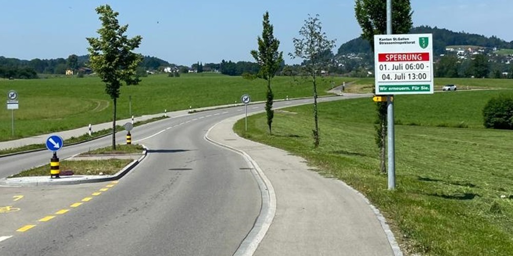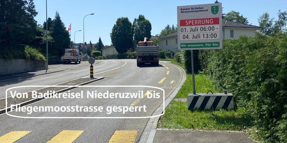 Das Strassenkreisinspektorat Gossau führt am Montag, 1. Juli 2024, 7 Uhr, bis Donnerstag, 4. Juli 2024, 14 Uhr, Belagsarbeiten an der Flawilerstrasse in Uzwil und Oberuzwil aus. Die Strasse wird zwischen dem Badikreisel und der Fliegenmoosstrasse während dieser Zeit für sämtlichen Verkehr gesperrt. Bei ungünstiger Witterung verschieben sich die Arbeiten auf den nächsten Arbeitstag.