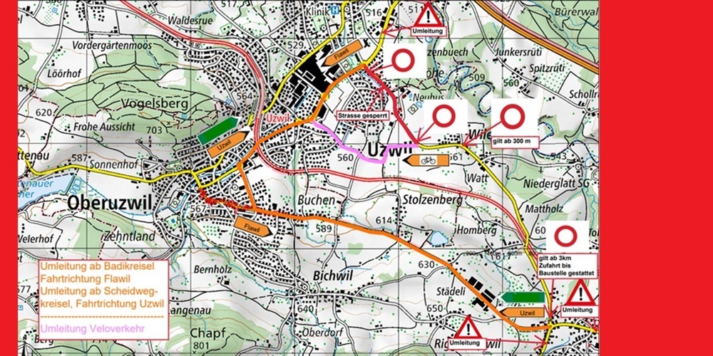Umleitung über Oberuzwil via Wiesental- und Morgenstrasse. Die Umleitung ist grossräumig signalisiert. |