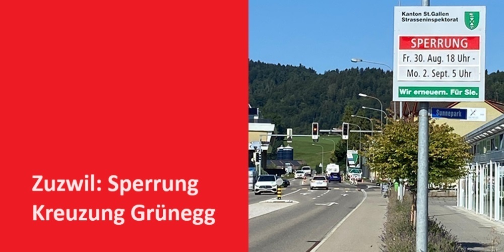 Das kantonale Tiefbauamt schliesst mit den Belagsarbeiten bei der Kreuzung Grünegg die Bauarbeiten in Zuzwil ab. Um die Arbeiten speditiv und effizient durchzuführen, wird der Knoten für den motorisierten Verkehr gesperrt. Die Sperrung dauert von Freitagabend, 18 Uhr bis Montagmorgen, 5 Uhr. Radfahrende und die Zufussgehende können die Baustelle mit Behinderungen passieren.