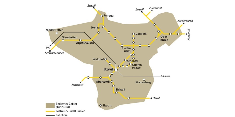 In der Region Uzwil fährt bis Ende Jahr ein Postauto ohne feste Linien und ohne Fahrplan. Im Rahmen eines Pilotbetriebs gibt es vom 2. September bis zum 20. Dezember 2024 das Angebot «PubliCar Uzwil». Dabei handelt es sich um einen Rufbus, der sehr flexibel genutzt werden kann: Anstelle von Linien gibt es ein Bediengebiet und statt eines Fahrplans bestehen Bedienzeiten. Kundinnen und Kunden können den PubliCar innerhalb des Bediengebiets für selbst definierte Fahrten von Tür zu Tür nutzen und die Abfahrtszeit selbst bestimmen.