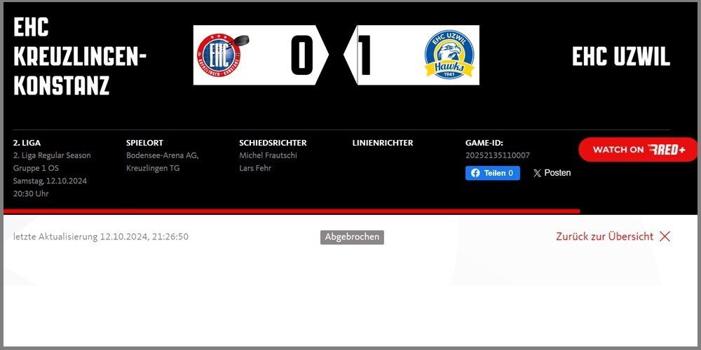 SPIELABBRUCH: Aufgrund einer schweren Verletzung eines Kreuzlinger Spielers wird die Partie noch im 1. Drittel abgebrochen. Wir wünschen dem verletzten Spieler gute Genesung!