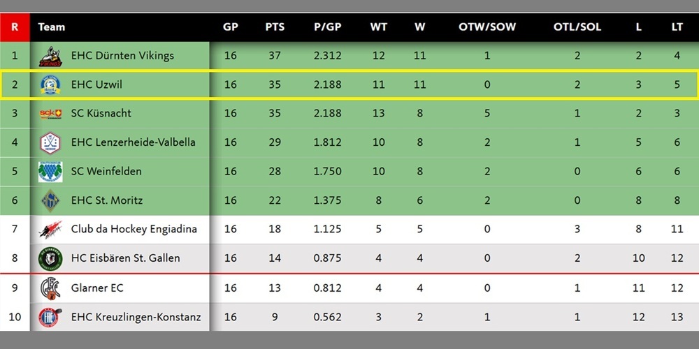 Der EHC Uzwil ist als aktueller Tabellenzweiter bereits seit Längerem für die Playoffs qualifiziert. Fest steht auch, dass die Hawks nach der "regular season" auf Rang 1 bis 4 landen werden und damit in jedem Fall Heimrecht beim Playoff-Start geniessen werden. Gegen wen wird sich in den nächsten zwei Spielen entscheiden.