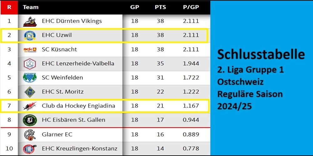 Damit überholten die Hawks den SC Küsnacht und eroberten Platz 2 zurück. Gegner am Dienstag, 4. Februar 2025, ist somit der Club da Hockey Engiadina (Rang 7). Die Hawks zeigten sich - auch dank der Rückkehr einiger angeschlagener Spieler - bereits in Playoff-Form: Hopp Uzwil!