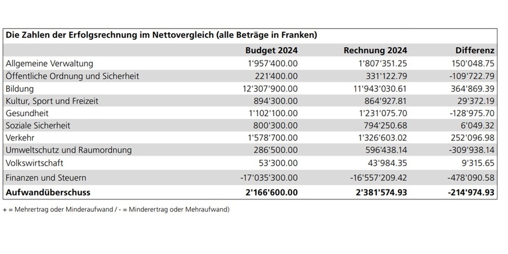 Das Budget 2025 rechnet mit Aufwänden von 29'839'600 Franken und Erträgen von 28'143'500 Franken, was ein Defizit von 1'696'100 Franken ergibt. Die prognostizierten Ausgaben sinken gegenüber dem Jahr 2024 um rund 37'000 Franken. Die vom Gemeinderat evaluierten Sparmassnahmen von einigen 100'000 Franken tragen Früchte. Einerseits wurden der Personalaufwand und die Anlässe für die Bevölkerung optimiert und die Einnahmen optimistisch budgetiert.