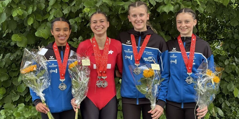 Ähnlich früh ging es am Sonntag, 15. Juni für die Juniorinnen dann los. Der 4er U19 mit Sumaya Lenherr, Jael Schnetzer, Salome Schnetzer und Livy Wild startete um kurz nach 8.30 Uhr in ihren Wettkampf. Sie waren sehr nervös, konnten sich jedoch während der Kür gut fokussieren und so eine neue Bestleistung herausfahren. Diese reichte ihnen zur Silbermedaille. Über 6 Stunden später startete Sumaya als erste Uzwiler Sportlerin in der 1er Kategorie. Im Vergleich zu den letzten Trainings konnte sich Sumaya enorm steigern und so eine starke Kür präsentieren. Sie platzierte sich auf dem 13. Schlussrang. Nochmals 2 Stunden später waren Jael, Livy und Salome, alle ebenfalls im 1er U19 am Start. Trotz schlechtem Gefühl vor ihrem Start, konnte Jael eine ruhige und solide Kür zeigen. Nur wenige Hundertstel fehlten am Schluss für eine neue Bestleistung. So wurde sie schlussendlich gute Sechste. Schweizermeisterschaften lagen Livy in der Vergangenheit jeweils nicht sehr gut. In diesem Jahr schlichen sich aber nur ein paar kleine Fehler ein, weshalb sie mit ihrer Leistung und dem 7. Rang zufrieden war. Für Salome war das Ziel eine solide Kür zu zeigen und sich so den Schweizermeistertitel zu sichern. Dank Nervenstärke und sehr ruhiger Haltung, gelang ihr dies bravourös. Da die vor ihr platzierte Sportlerin Doppelbürgerin ist und an der EM für Deutschland an den Start ging, kann sie nach Verbandsreglement keine Schweizermeisterin werden. Darum gewann Salome neben der Silbermedaille auch den Schweizermeistertitel.