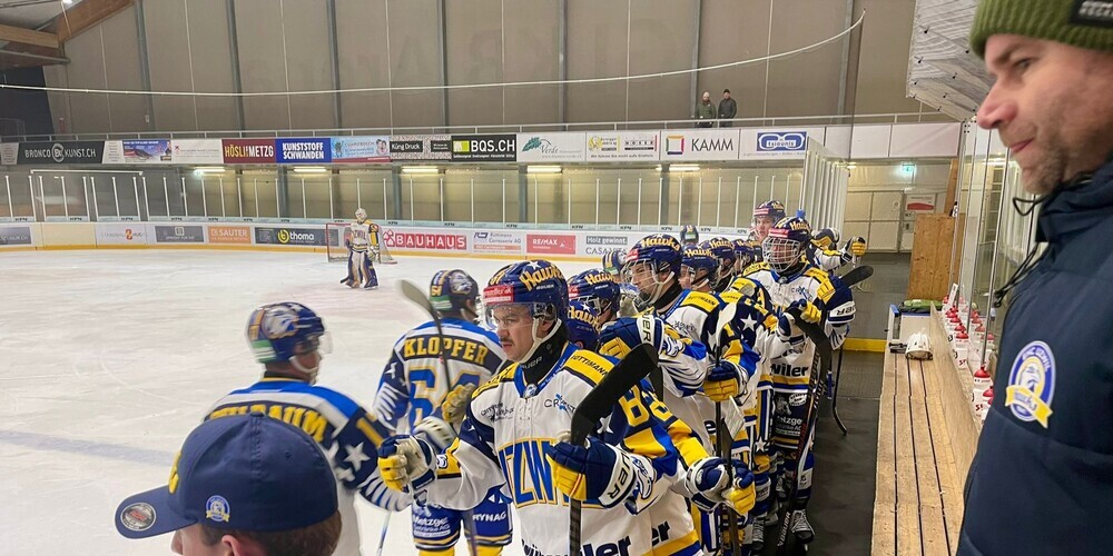 Unter den Augen von Cheftrainer Michi Hürlimann (ganz rechts) traten die Hawks beim Glarner EC in den neuen Auswärtstrikots im Retro-Look an.
