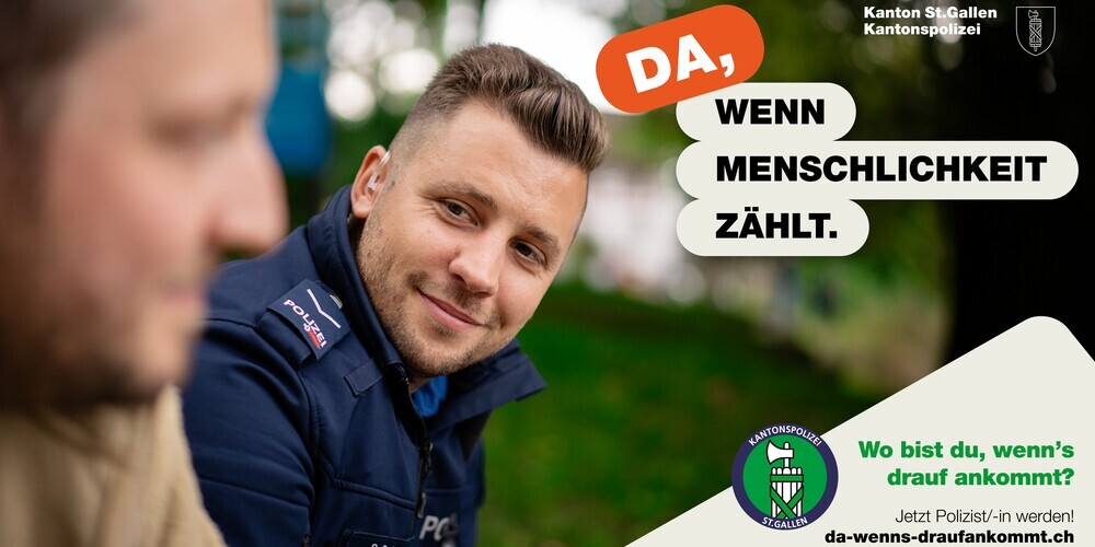 In den kommenden Wochen wird die neue Kampagne unter anderem auf den Social-Media-Kanälen der Kantonspolizei St.Gallen ausgespielt. Sie soll authentische Einblicke in den abwechslungsreichen Berufsalltag vermitteln, indem verschiedene Aufgaben- und Fachbereiche mit passendem Slogan vorgestellt werden. Ausserdem berichten Polizistinnen und Polizisten in einem Kurzvideoformat von Einsätzen und Momenten, in denen sie da waren, als es drauf ankam.
