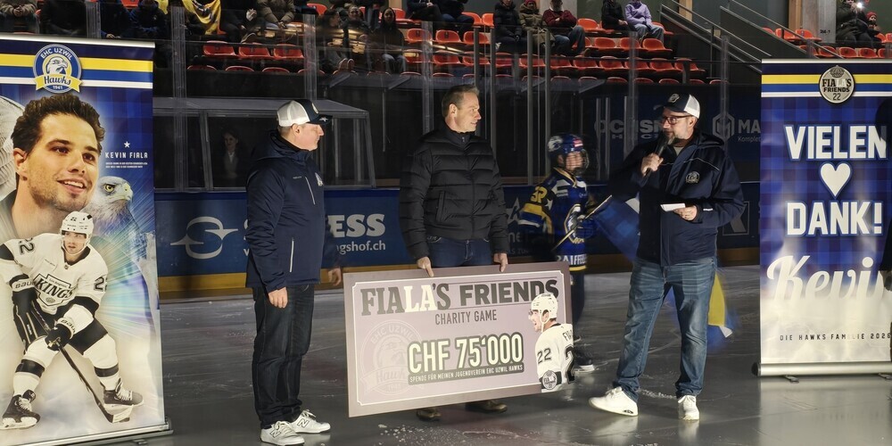 Die Überraschung war auch für die Verantwortlichen gross, als sie vor dem Spiel den symbolischen Check in der Höhe von CHF 75'000 entgegennehmen durften. Wie kam es dazu? Im August 2025 hatte der NHL-Crack Kevin Fiala im Rahmen eines von ihm organisierten Charity Games, an dem auch die Nachwuchsspieler der Hawks als Zuschauer dabei sein durften, Geld für das Kinderspital St.Gallen und für die Nachwuchsabteilungen seiner beiden Ausbildungsvereine EHC Uzwil Hawks und ZSC gesammelt. Davon kann nun auch der EHC Uzwil profitieren. Der beste Dank dafür geht an Kevin Fiala und seine Familie.