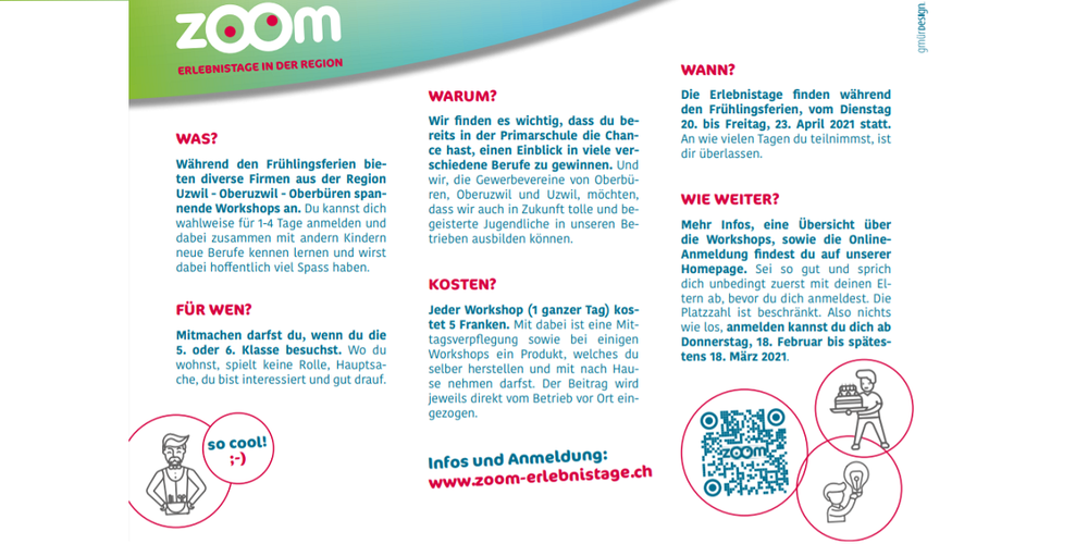 Es ist eine Freude für die Organisatoren der Gewerbevereine Uzwil, Oberuzwil und Oberbüren, die 27 teilnehmenden Firmen und alle interessierten Kinder, dass die zoom-Tage dieses Jahr durchgeführt werden können. Selbstverständlich sind die beteiligten Firmen verantwortlich, dass die geltenden Schutzmassnahmen vor Ort eingehalten werden.
