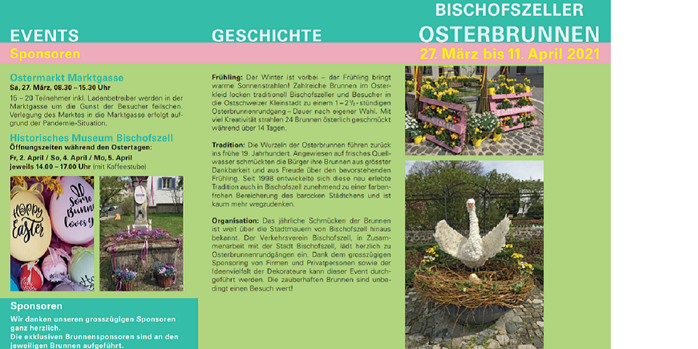 Die Wurzeln der Osterbrunnen führen zurück ins frühe 19. Jahrhundert. Angewiesen auf frisches Quellwasser schmückten die Bürger ihre Brunnen aus grösster Dankbarkeit und aus Freude über den bevorstehenden Frühling. Seit 1998 entwickelte sich diese neu erlebte Tradition auch in Bischofszell zunehmend zu einer farbenfrohen Bereicherung des barocken Städtchens und ist kaum mehr wegzudenken. Das jährliche Schmücken der Brunnen ist weit über die Stadtmauern von Bischofszell hinaus bekannt. Der Verkehrsverein Bischofszell, in Zusammenarbeit mit der Stadt Bischofszell, lädt herzlich zu Osterbrunnenrundgängen ein. Dank dem grosszügigen Sponsoring von Firmen und Privatpersonen sowie der Ideenvielfalt der Dekorateure kann dieser Event durchgeführt werden.