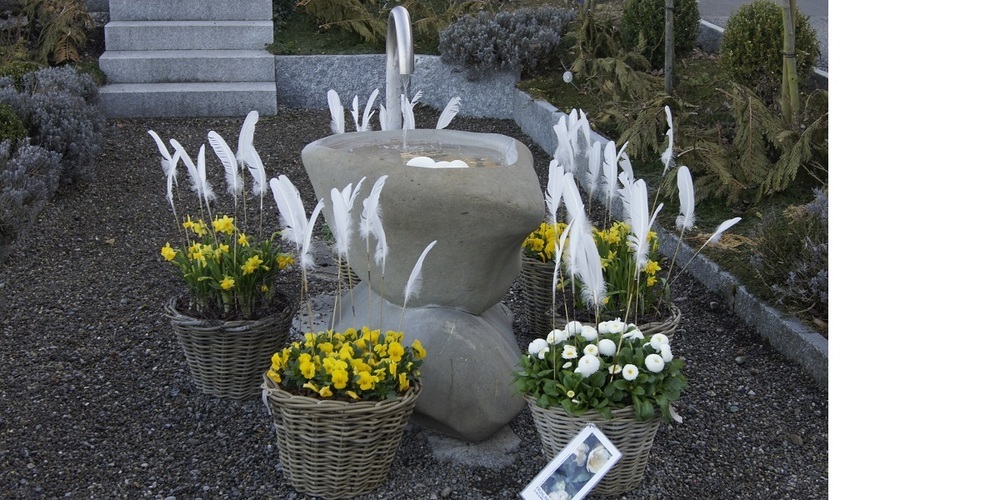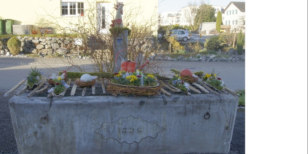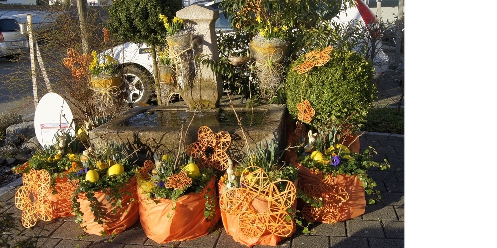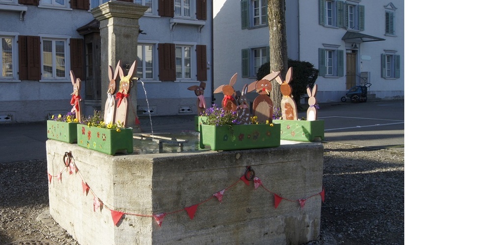 Osterhasen Hühner, Hähne und viele kleine «Zutaten» im Osterkleid locken während gut 14 Tagen Bischofszeller und Besuchende in die Ostschweizer Kleinstadt zu einem 1– 2 1 /2 - stündigen Osterbrunnenrundgang. Mit viel Kreativität sind die 24 Wasserspender österlich geschmückt worden.