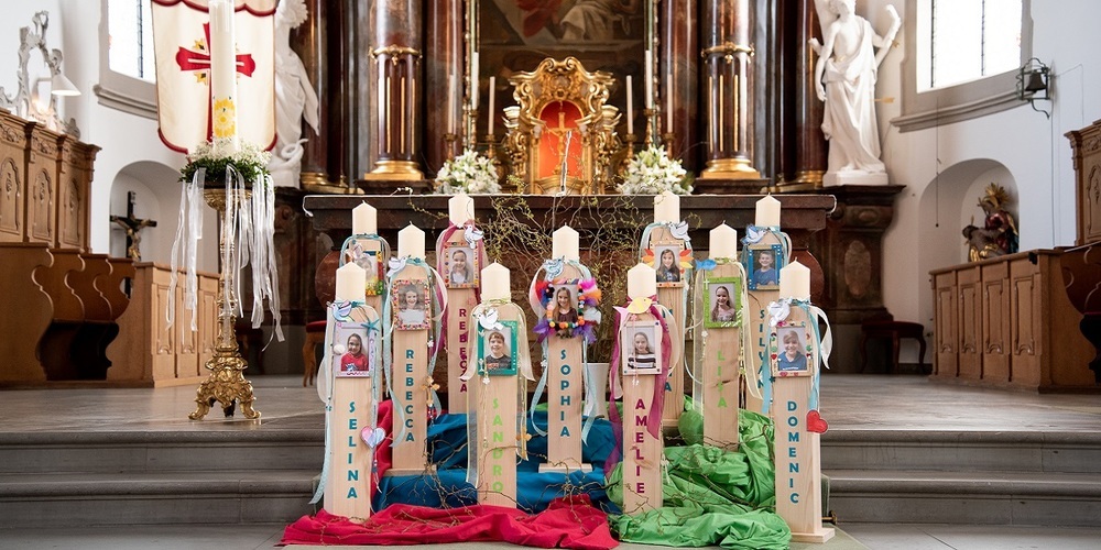 Die bunt geschmückten Holzstelen mit einer Kerze darauf zeigten die Erstkommunionkinder als „Licht der Welt“. Die Gottesdienstbesucher erfuhren von den Kindern, wie sie die Welt heller machen möchten: „Mit Kleinigkeiten wie zum Beispiel mit einem Lächeln, indem wir freundlich zueinander sind oder wenn wir füreinander da sind und niemanden ausschliessen, dann bringen wir Licht in die Welt.“