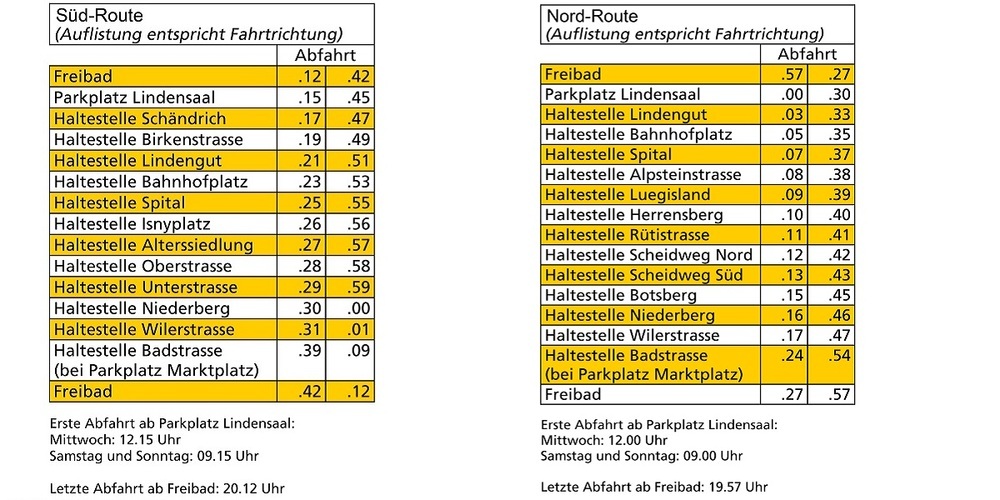 Die bisherigen beiden Badi-BUS-Linien werden beibehalten. Zwei Kleinbusse fahren im Halbstundentakt über eine Nord- und eine Süd-Route. Die Nord-Route führt vom Freibad zum Parkplatz des Lindensaals über die Haltestellen Lindengut, Bahnhofplatz, Spital, Alpsteinstrasse, Luegisland, Herrensberg, Rütistrasse, Scheidweg Nord, Scheidweg Süd, Botsberg, Niederberg, Wilerstrasse und Badstrasse zurück zum Freibad. Auf der Süd-Route wird die Strecke Freibad–Parkplatz Lindensaal–Schändrich–Birkenstrasse–Lindengut–Bahnhofplatz–Spital–Flawa–Altersiedlung–Oberstrasse–Unterstrasse–Niederberg–Wilerstrasse–Badstrasse–Freibad bedient. Der Badi-BUS hält an den üblichen Bushaltestellen, welche zusätzlich mit einer «Badi-BUS-Tafel» gekennzeichnet sind. Auf diesen Tafeln sind neu auch die ungefähren Abfahrtszeiten angegeben.