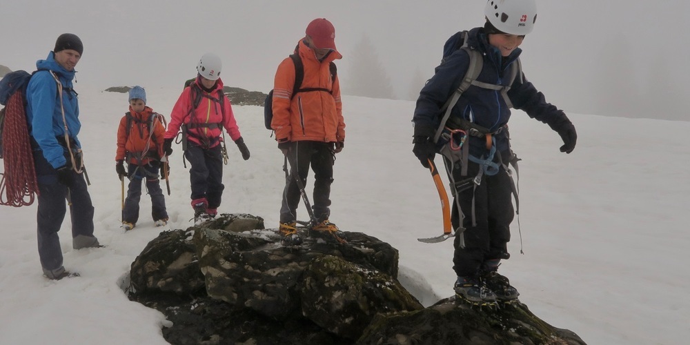 Im Kinderbergsteigen ging es vorerst darum, einen Erstkontakt mit dieser Art des Bergsteigens zu ermöglichen. So wurden z.B. die Steigeisen an die Bergschuhe angepasst, um damit im Schnee und auf Felsblöcken das Gefühl fürs Laufen zu wecken. Simuliert wurde die Begehung eines verschneiten Gletschers, in dem Seilschaften gebildet wurden. Für die am Ende des Seiles sich befindenden Personen hiess es, eine Seilverkürzung um den Oberkörper zu legen. Eine Seilverkürzung wird dann angewandt, wenn nicht das ganze Seil benötigt wird. Mit den angetroffenen Schneeverhältnissen bot es sich an, eine solide Schneeverankerung zu graben. Dies wird benötigt, wenn man abseilen muss oder für eine Spaltenrettung eine feste Verankerung gebraucht wird.