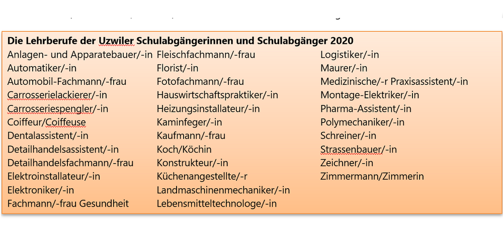 Wie vielfältig eine Berufslehre in Uzwiler Betrieben sein kann, wie unterschiedlich die Welten sind, in denen sich die Lernenden bewegen, zeigt die Rückseite des Uzwiler Blattes und die Bilderwelt des Geschäftsberichtes. Klar scheint: Die berufliche Grundausbildung als praktisch orientierter Weg steht in Konkurrenz zur zunehmenden Akademisierung, sie wandelt und verändert sich laufend. Und sie ist Basis für lebenslanges Lernen, öffnet so eine Vielzahl von Berufsperspektiven. Gerade die Uzwiler Arbeitswelt mit ihrem vielfältigen Angebot ist voller Möglichkeiten für junge Menschen.