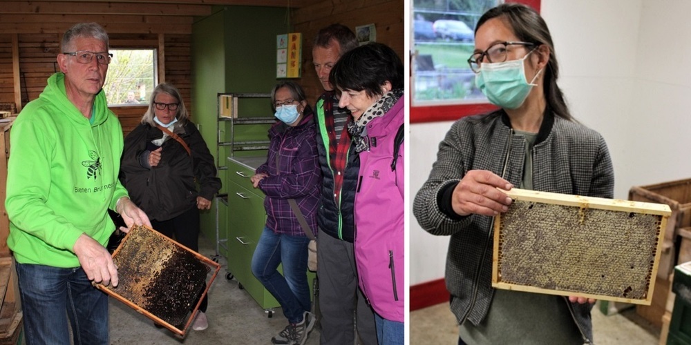 Im vor drei Jahren erweiterten und neu gebauten Bienenhaus vermittelte der begeisterte Imker und Bienenzüchter August Brunner den interessierten Besucherinnen und Besuchern viel Wissenswertes über das Leben der Bienen und über die ökologische Bedeutung. Neben dem grossen Bienenhaus auf seinem Grundstück betreut er Bienenvölker an vier weiteren Standorten. Ein Volk bestehe aus etwa 50‘000 Honigbienen, Drohnen und einer Königin, die unterschiedliche Aufgaben erfüllten, informierte er die Naturfreunde. In den Kästen befinden sich im unteren Teil die Brutwaben mit der Königin und den Drohnen und über einem Zwischenrost die etwas kleineren Honigwaben. Die eingesammelten Pollen sondern sich auf der Pollenfalle ab und sind als geniales Produkt für ihre stärkende, anregende und aufbauende Wirkung bekannt. Ein weiteres Naturheilmittel, welches die Honigbienen produzieren ist das wertvolle Propolis, welches das Bienenvolk als klebriges Baumaterial zum Verschliessen undichter Stellen an Bienenstöcken einsetzt. Etwa zwei Drittel des gesammelten Honigs benötigen die Bienen für den Eigenbedarf. Der Rest ist der Ertrag des Imkers. Ein Volk erzeugt etwa zehn bis fünfzehn Kilo Honig pro Jahr. Neben einer Schweizer Bienenrasse hält Brunner auch die etwas resistentere Carnicarasse.
