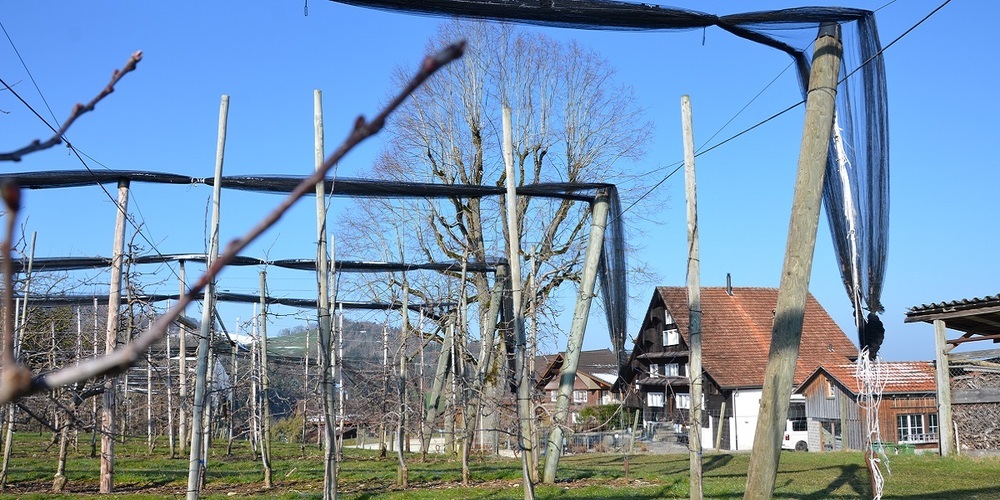 Die Züchtung von niedrigen Kirschbäumen bringt viele Vorteile. Neben der Einsparung von Personalkosten können kleinere Bäume auch viel besser mit Netzen geschützt werden. Roman Stüdli zeigt auf die Regenfolie und das Hagelnetz, die über die Anlage gespannt werden und bei fachmännischer Anwendung einen guten Schutz vor Vögeln und bestimmten Witterungseinflüssen wie etwa Regen oder Hagel bieten. Kurz vor der Ernte wird ein feinporiges weisses Netz rund um die Anlage gespannt. Es stellt die einzig wirksame Methode im Kampf gegen die Kirschessigfliege dar.