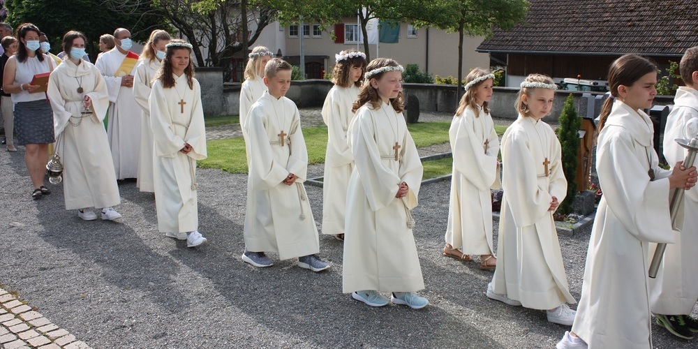 Dieses Jahr mussten sich die sieben Erstkommunionkinder aus Lenggenwil noch länger gedulden: Das Fest war aufgrund der Corona-Situation vom Ostermontag auf den 13. Juni verschoben worden. Als Entschädigung schickte Petrus traumhaftes Wetter nach Lenggenwil und so war allen Beteiligten die Freude darüber, endlich wieder einmal ein Fest feiern zu dürfen, sichtlich anzusehen. Auch den Mitgliedern der Musig Lenggenwil, die beim feierlichen Einzug ihre 2019 angeschaffte, neue Uniform erstmals für einen Auftritt im Freien präsentieren konnten. Sie sorgten für den schönen musikalischen Rahmen vor und nach dem Gottesdienst, während der Feier taten dies die Kinder gleich selbst: Lia Bernhardsgrütter mit dem Cornet, Eloye Jung mit der Flöte und Sina Rusch mit der Geige zeigten im Gottesdienst einen Ausschnitt ihres Könnens. Daneben sorgte traditionell der Jungwacht-Chor mit der Pfälzer Kindermesse für eine fröhliche Stimmung im Gotteshaus.