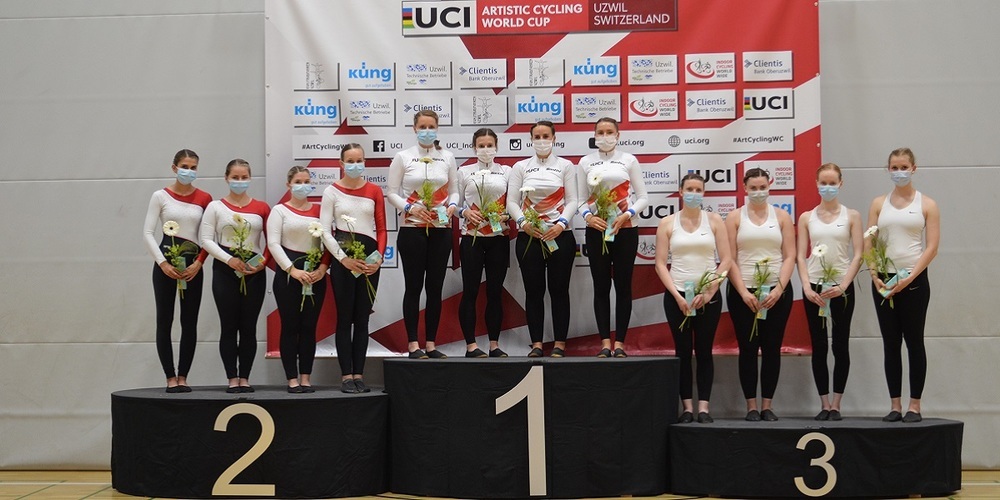 Nach einer Eröffnungsfeier, bei welcher die sechs teilnehmenden Nationen präsentiert und die UCI Flagge gehisst wurde, durften die 1er Damen an den Start. Die amtierende Weltmeisterin Milena Slupina aus Deutschland konnte diese Kategorie für sich entscheiden. Kunstradsport auf hohem Niveau war dann auch bei den 2ern der offenen Klasse zu sehen. Trotz langer Wettkampfpause gelang allen drei Paaren eine super Kür. Mit einem neuen Weltrekord von 168.94 Punkten sicherten sich Serafin Schefold und Max Hanselmann, ebenfalls amtierende Weltmeister, den Tagessieg. Die Kategorie 2er Damen konnte das deutsche Duo Möhrle/Wurth für sich entscheiden. In der darauffolgenden Kategorie 1er Herren warteten alle gespannt auf den Auftritt vom amtierenden Weltmeister Lukas Kohl. Schon im ersten Bild musste er vom Rad, weshalb seine ausgefahrene Punktzahl nicht so hoch war wie gewohnt. Trotzdem platzierte sich der Deutsche auf dem 1. Rang. Als letzte Kategorie folgten die Vierer. Alle fünf teilnehmenden Mannschaften reichten eine ähnlich hohe Punktzahl ein, was viel Spannung versprach. Aus Uzwiler Sicht war diese Kategorie besonders spannend, denn mit Fabienne Haas und ihren Teamkolleginnen aus Rheineck und dem heimischen 4er Elite waren gleich zwei Uzwiler Startnummern vertreten. Beide Mannschaften wollten sich möglichst gut präsentieren und um die Podestplätze mitkämpfen. Der 4er Rheineck/Uzwil zeigte eine saubere Kür mit nur wenigen Abzügen. So konnten sie nach drei Startern die Führung übernehmen. Als nächstes folgten die Europameisterinnen. Die vier Deutschen zeigten eine nahezu makellose Kür und setzten sich so an die Spitze. Nun lag es an den Uzwiler Lokalmatadorinnen Stefanie Haas, Valerie Unternährer, Sarah Manser und Selina Niedermann, ihre bestmögliche Leistung abzurufen. Sie bewahrten die Ruhe und konnten ihre Kür schön zu Ende bringen. Leider gab es in der Mitte einen kleinen Patzer, der viele Punkte kostete. So reichte es am Schluss knapp nicht mehr auf das Podest. Die vier Fahrerinnen sind trotzdem zufrieden mit ihrer Darbietung. Mit einem zweiten Platz vom 4er Rheineck/Uzwil konnte der veranstaltende Verein «Kunstradfahren Uzwil» also auch im Weltcup einen Erfolg feiern.