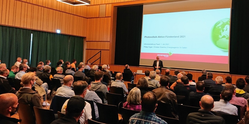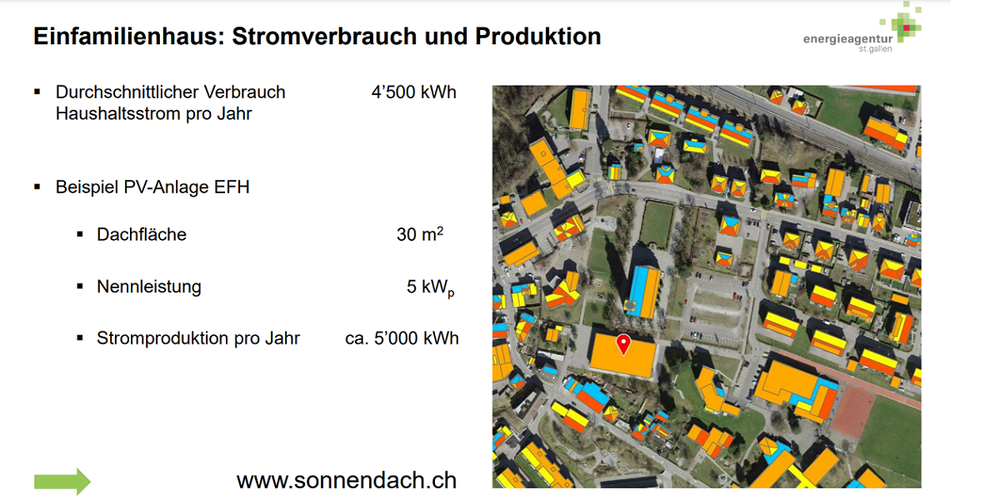 Projektleiter Christian Eisenhut stellte anschliessend die konkrete "PV-Aktion Fürstenland" vor. Das preiswerte Angebot (rund 15'000 Franken für eine 5 kWp-Anlage bzw. 30 m2 Solardach, minus Förderbeiträge) überzeugt aus mehreren Gründen. Die Hauseigentümer erreichen mit einer Solaranlage auf dem Dach eine Wertsteigerung ihrer Liegenschaft und generieren eigenen Strom. Gibt es Überschüsse, können diese ins öffentliche Stromnetz eingespiesen werden und werden vergütet.