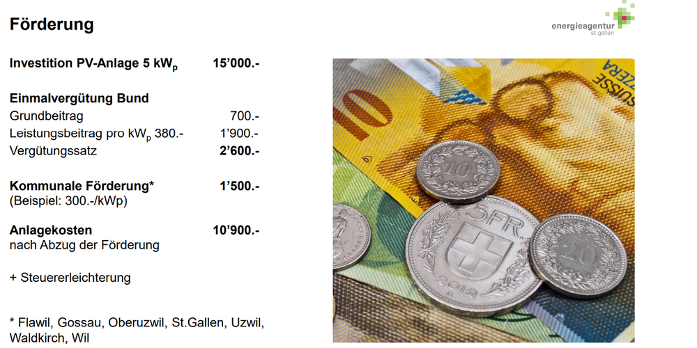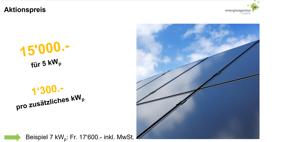 Das Aktionspaket, das auf den untenstehenden Folien beschrieben wird, ist in der Tat sehr attraktiv. Die Energieagentur St.Gallen hat den "Transaktionsaufwand" für die Beschaffung einer PV-Anlage wesentlich verringert, also nicht nur den Preis, sondern auch den zeitlichen Aufwand für die Evaluation eines PV-Partnerns und für die Koordination von Bewilligung, Förderungen, Installation und Abnahme. Die PV-Partner erfüllen die festgelegten Kriterien ebenso wie die installierte PV-Lösung auf dem Dach. So sind schnelle Entscheidungen und Realisierungen möglich.