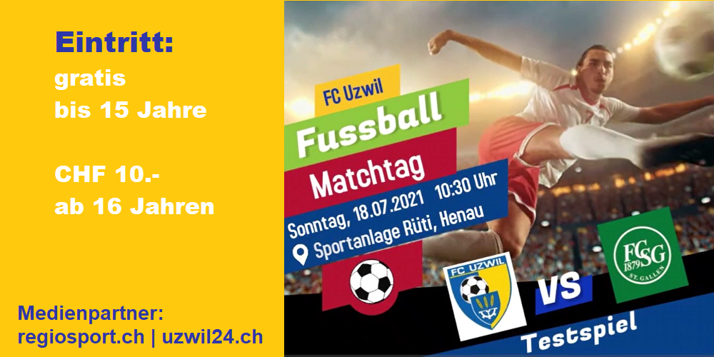 Damit Sie aufgrund der Registrierung (Corona-Schutzkonzept) nicht den Anpfiff verpassen, bittet Sie der FC Uzwil, rechtzeitig auf dem Sportplatz Rüti in Henau einzutreffen. Die Festwirtschaft ist ab 09:30 Uhr geöffnet.