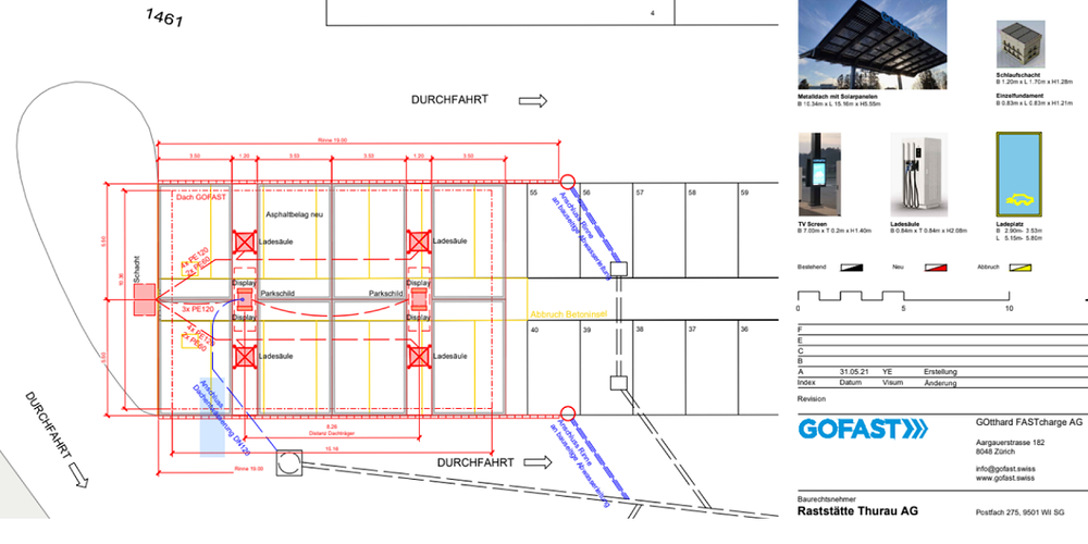 Mit der Erstellung dieser Schnellladestationen wird die GOtthard FASTcharge AG einem wachsenden Bedürfnis gerecht, steigt doch die Zahl immatrikulierter Elektrofahrzeuge schneller als noch vor Kurzem erwartet. Zudem werden in den nächsten Monaten und Jahren sehr viele neue Modelle aller führenden Marken auf den Markt kommen. Es entstehen sowohl bei Thurau Nord als auch bei Thurau Süd je acht überdachte Stationen, die vom St.Galler Ingenieurbüro K. Vogt AG geplant worden sind und ab September auch realisiert werden.
