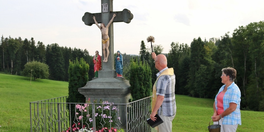 Das Wegkreuz erinnert an den Tod von Jesus. Auf der rechten Seite steht Maria, seine Mutter. Die Deutung der Figur auf der linken Seite ist nicht eindeutig, wahrscheinlich ist sie der Lieblingsjünger von Jesus. Pater Erich meinte, dies könnten wir alle sein. Das Leiden und Sterben von Jesus war ein Zeichen der Solidarität. Durch das Kreuz werden wir immer wieder aufgefordert, das Machbare zu tun und das, was nicht machbar ist, anzunehmen und auszuhalten.