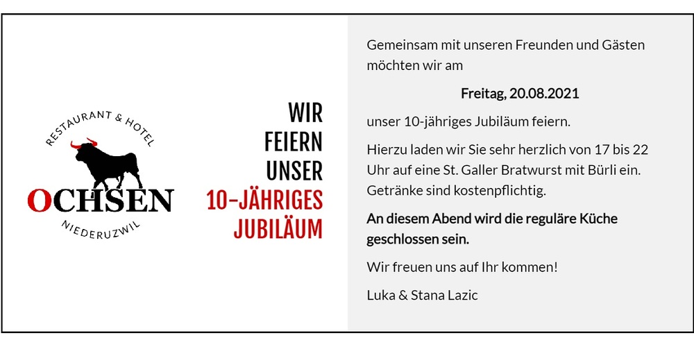 Luka und Stana Lazic feiern am Freitag, 20. August 2021, gemeinsam mit Freunden und Gästen das 10-Jahr-Jubiläum als Wirtsleute auf dem Restaurant & Hotel Ochsen in Niederuzwil. Von 17:00 bis 22:00 Uhr gibt es St.Galler Bratwurst mit Bürli; die Getränke sind kostenpflichtig. Die reguläre Küche ist heute Abend geschlossen.