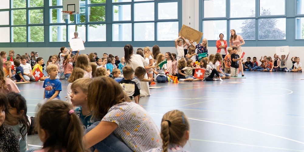 In der MZA Breite ertönten zu Beginn melodische Alphorn-Klänge, gespielt von den Oberuzwilern Renata Jeker und Franz Jeker und begleitet vom Fahnenschwinger Gebi Kern. Im Publikum schwangen die Schülerinnen und Schüler weitere Nationalflaggen, unter anderem von Griechenland, Italien, Portugal, Türkei, Belgien usw. Zählte man alle Fahnen, ergaben sich 24 verschiedene Nationen auf die insgesamt 438 Lernenden der Primarschule Breite. Die Vielfalt macht’s aus! Traditionell erhalten die neuen Erstklässler und Erstklässlerinnen in Oberuzwil einen eigenen Beerenstrauch. Alle anderen Klassen bekamen eine Flagge mit den bei ihnen vertretenen Nationen. Diese werden bald über den Eingangstüren der Schulhäuser hängen!