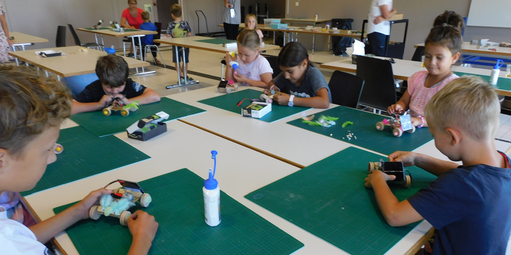 Beim Bau eines kleinen Solarautos lernten die Kinder die Kraft der Sonne kennen und nutzen. Zum Basteln zur Verfügung gestellt wurden bunte Steine, Federn, Glitzer- und Farbstifte und vieles mehr. Die Kinder dekorierten ihre Sonnenflitzer so, wie es ihnen gefiel. Einige von ihnen klebten sogar Wackelaugen auf ihr Gefährt, um es zum Leben zu erwecken.