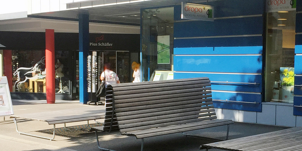 Die Gestaltungsidee sieht entlang der Bahnhofstrasse Sitzgelegenheiten vor, welche die Aufenthaltsqualität für die Fussgängerinnen und Fussgänger erhöhen. Als Versuch wurde Anfang Mai 2021 im Bereich der Drogerie Peterer die Gestaltungsidee umgesetzt. Es wurden drei Sitzbankelemente montiert. Die zusätzliche Möblierung erwies sich aber als ungeeignet. Die Rückmeldungen aus der Bevölkerung haben ergeben, dass die Elemente für diesen Ort zu gross sind. Sie werden deshalb im Herbst 2021 wieder entfernt. Die Sitzbankelemente werden andernorts weiterverwendet. Zum Beispiel als Sitz- und Liegemöglichkeit im Freibad Böden.