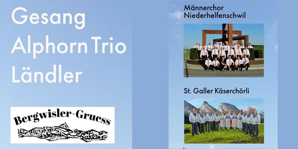 Unter der Leitung von Gerda Hardegger wird das Publikum mit stimmigen Liedern vom Männerchor Niederhelfenschwil und beliebten Jodelgesängen vom St.Galler Käserchörli erfreut. Auch das Ländlertrio „Bergwisler-Gruess“ und ein Alphorntrio werden die Zuhörer begeistern.