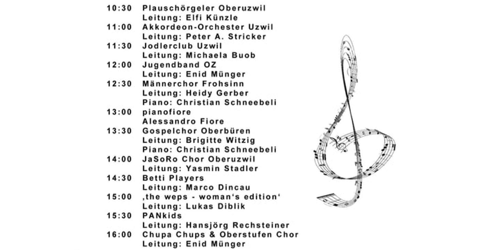 Plauschörgeler Oberuzwil, Akkordeon-Orchester Uzwil, Jodlerclub Uzwil, Jugendband OZ, Männerchor Frohsinn Oberuzwil, pianofiore, Gospelchor Oberbüren, JaSoRo Chor Oberuzwil, Betti Players, «the weps – woman’s edition», PANkids, Chupa Chups und Oberstufen Chor.